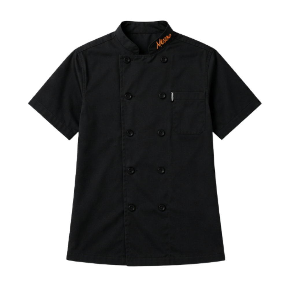 Custom black short sleeve chef coat orange Mesero logo on left collar. Left chest and sleeve pocket. Pen pockets. Optional embroidered name on right chest.