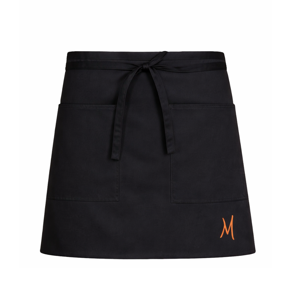 Half Bistro Apron, centered divided two pocket, poly cotton, 36″ tie, 6 ounce, black with M in orange embroidered left center thigh 3″ up from hem. 19 x 28″