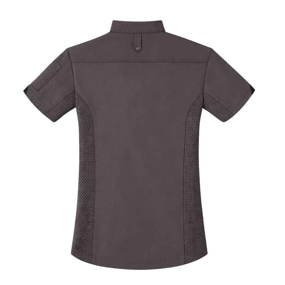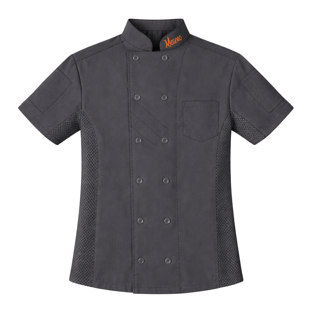Unisex Pewter short sleeve Chef coat , inverted v-notch, zipper front, Logo on left collar in black thread, 2 pockets.